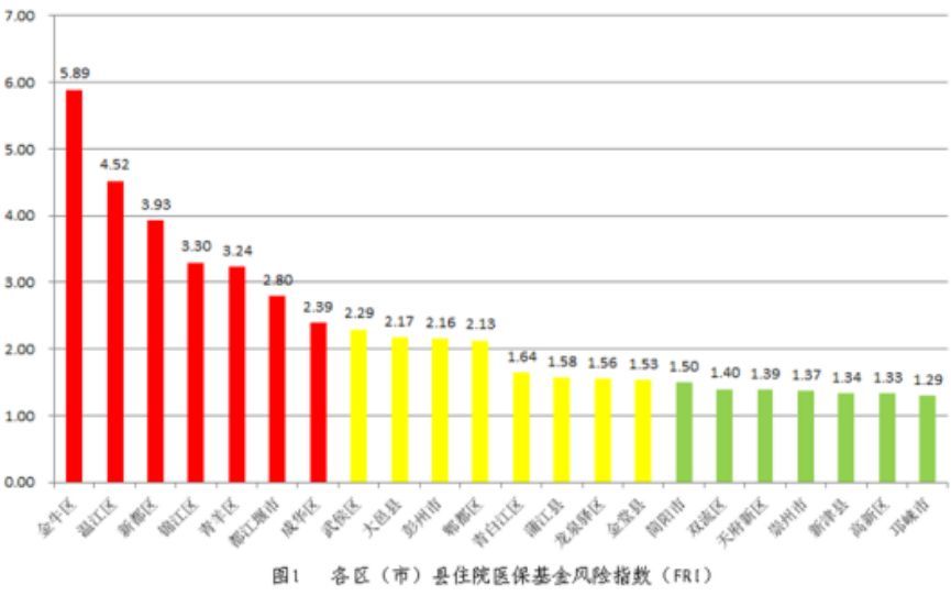 举个例子,中心运用经典统计学办法(加权秩和比法)构建风险预警评价模型,对全市城镇职工基本医疗保险基金风险运行情况进行分析,监测各区(市)县在医保基金管控上的风险等级和风险指数(FRI指数),从整体上把握医保基金风险的分布情况及对不同区(市)县风险等级差异进行比较。