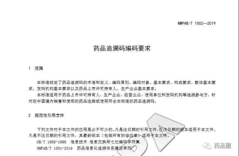 为贯彻落实《国务院办公厅关于加快推进重要产品追溯体系建设的意见》(国办发〔2015〕95号)和《国家药监局关于药品信息化追溯体系建设的指导意见》(国药监药管〔2018〕35号)等文件要求,推动药品信息化追溯体系建设,国家药监局组织编制了《药品信息化追溯体系建设导则》和《药品追溯码编码要求》两项信息化标准(见附件)。现予发布,自发布之日起实施。