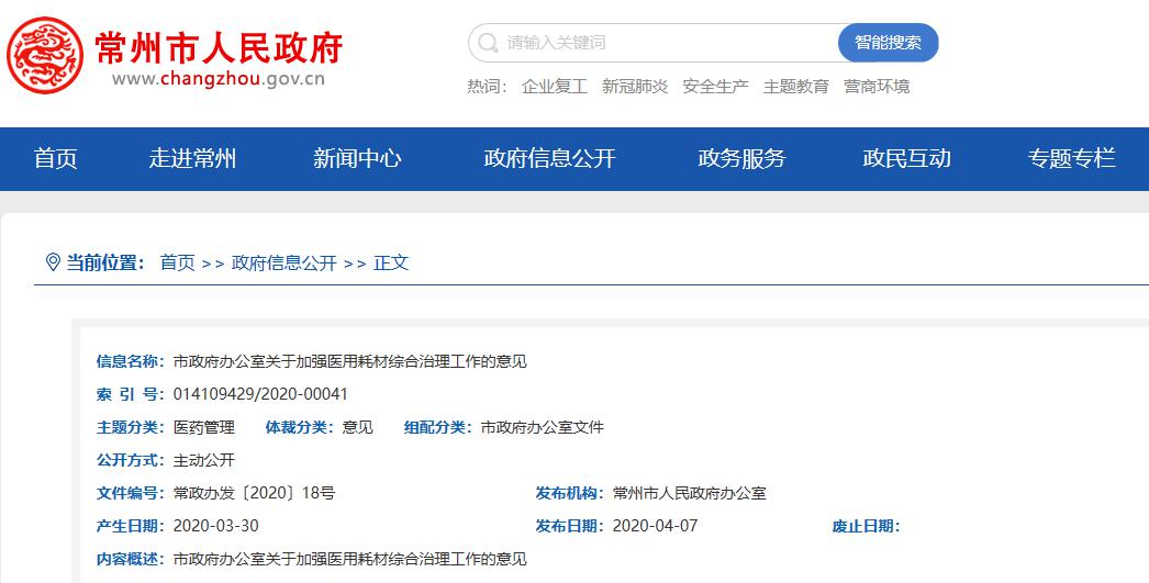 4月7日,常州市人民政府最新发布了《关于加强医用耗材综合治理工作的意见》(以下简称《意见》)。