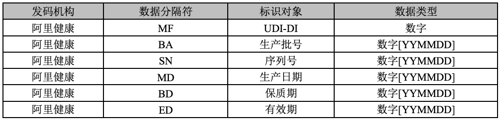 表9 发码机构阿里健康数据分隔符、标识对象及数据类型